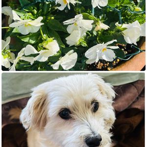おはようございます☀️ パンジーさんかビオラさん? ホワイトは清楚ですね ワンワン祭り🏷️バトンハウスさんのワンワン祭り🏷️に 参加させていただきます🐶 今日も良き日を🤗