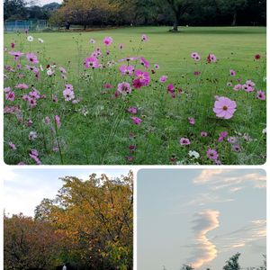今朝の散歩より。🚶♀️🎶 ⬆️近くの運動公園のコスモスが見頃です。 (*^▽^*) ↙️上の写真の左上辺りの紅葉です🎵😄 落葉の絨毯が綺麗です。✨ ↘️今日のラッキーナンバーは、「3」❕🤣🎶 頑張ろう❗日本‼️ 👊✨