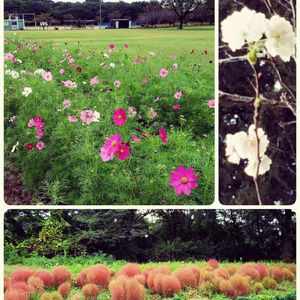 近くの運動公園です。 ↖️コスモスがたくさん咲いてきました。 これからが見ごろになります。✨ ↗️何種類かのサクラがちらほらと咲いていました。😃 ⬇️コキアも秋色になっています。🎶 頑張ろう❗日本‼️ 👊✨