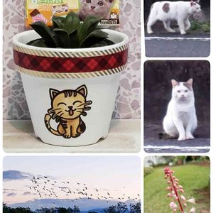 🏷️ニャンニャン祭り に参加します。😄🎶 ↖️スーパーで、可愛いネコちゃんのパッケージのチョコレートを見つけました🎵😋 何種類かあります。😸😹😼 にゃんこのリメ鉢に入っているのは、ハオルチア ショコラです。😄チョコツナガリ! ↗️家の近くを歩いていたネコちゃん。😃 ご近所ネコかしら。 ➡️「にゃーん。」と声をかけたら、こちらを向いてきちんとお座り❕😍🎶リメハチトオナジポーズ✨ お行儀がよい子です。✨ ↙️昨日の散歩で。 たくさんの鳥が飛んでいきました。😃 カモかも。😅 左の方の空に、ショートヘアの人の顔(鼻から上)が見えるのは、私だけ?😆💦 ↘️鉢植えのヒューケラのお花が咲き始めました。💗
