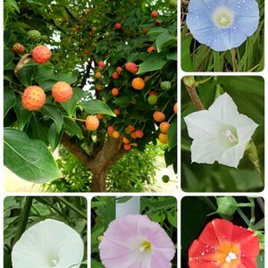 今朝の散歩より。 ↖️今年も公園のヤマボウシの実がたくさん色づいています。😃🎶カワイイ❣️ 他は、道端に咲いていた野生の朝顔っぽいお花達です。😄✨ 頑張ろう❗日本‼️ 👊✨