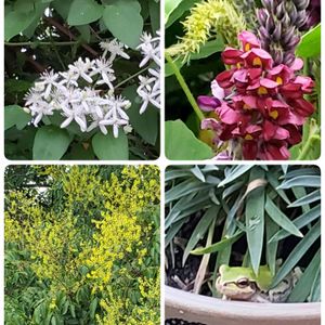 今朝の散歩道より。 ↗️グズ。 周囲に甘い香りが漂っていました。😃 ↖️センニンソウ。 たくさん咲いています。 ↙️オオモクゲンジ。 花後も綺麗なので、楽しみです。😄🎶 ↘️家の庭のカエル🐸ちゃん。😊 鉢植えのダイアンサスの株の下から、顔を出しています。💕 🏷️6日はカエルの日 に参加します。🎶 頑張ろう❗日本‼️ 👊✨
