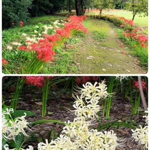 今朝の散歩より。✨ 近くの運動公園の紅白のヒガンバナも見頃です。😄🎶 頑張ろう❗日本‼️ 👊✨