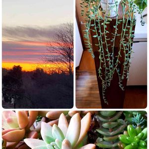 今朝は、昨日の強風が嘘のように止んでいました。😃 気温は零下でしたが、散歩に行ってきました。🚶♀️ ↖️朝焼けがとてもいい色で、綺麗でした。✨ ↗️アーモンドネックレス。 こんなに小さな鉢なのに、ここまで伸びました。😄🎶 大きな鉢に植え替えをしてあげなくちゃ❗😆 ⬇️室内組の寄せ植え。みんな明るい方を向いています。😅 アーモンドネックレスで、🏷️ネックレスの日に参加します。😊🎶 頑張ろう❗日本‼️ 👊✨