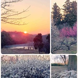 今朝の散歩より。 ↖️Sunrise! ↗️紅梅 白梅 杉の木 ↙️雪のような白梅 ↘️根がごつごつと地表に出ている木がありました❕ 頑張ろう❗日本‼️ 👊✨