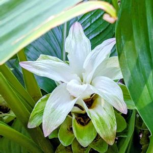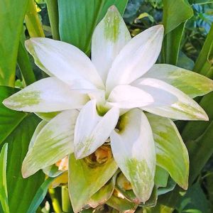 今日のお花は ウコン(鬱金)です。 幾重にも重なり 淡緑色から頂点に向かって白味を帯びて広がっている花に見える部分は花ではなく苞葉と呼ばれる葉っぱが変化したものなんです。 実際の花は 薄黄色で苞葉の間に見える部分で順次咲き上がっていきます。 ウコンには 春にピンクがかった花を咲かせる春ウコン 紫桃色の花を咲かせる紫ウコン そして この秋ウコンがあります。 別名ターメリックとも呼ばれカレー作りには欠かせないスパイスになるのは この秋ウコンの根茎から作られたものです…。🤗✨ インド原産。 ショウガ科ウコン属の多年草。