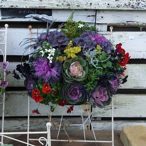 12月上旬 🌞 念願だった葉牡丹のハンギングバスケット教室に参加させていただきました! 講師の方は優しく丁寧に教えて下さいましたし、いつもお世話になってる花友さんや、お久しぶりの花友さん、そして一緒に参加してくれた長い友人の花友さん…ご縁があった皆さまたちと楽しくあたたかい休日を過ごすことができました🥰 お会いできた皆様ありがとうございました💕 お会いできなかった花友さんとも、いつかまたご一緒できたらなあと思いました😌 先生のお手本と同じ数の苗なのに、初心者が陥りがちな詰め込みによる「楕円形」ハンギングバスケットとなりお恥ずかしい限りです。 南国の森の中にあるような葉牡丹+トロピカルなイメージで作りました😆 次回は丸くなってほしいと念をこめて、シンプルに作りたいと思います😊 家の者に、「この葉牡丹はこっちにして、並べてみたらどうか」等と先生のお手本のお写真みながらダメ出しされましたが割と的を得ており、今回は納得。 離れて見るのは大切との先生のアドバイスが蘇ってきました😉