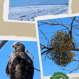 流氷が接岸し風が痛いんです! ズームすると人が3人流氷の上に乗っています💦キケンですよ~ 大好きなオジロワシ!!近くの川に餌を求めて来るのを何度もスマホ📲で撮りました。羽根を広げると2m位あるの!カッコいい〜😆💕 白樺の木にヤドリギがアチコチで見られます🌿
