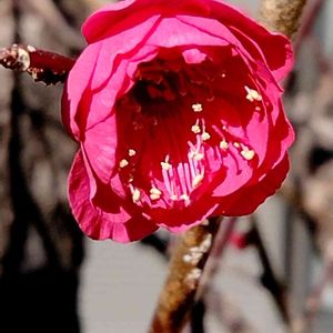 紅梅の 蕊の長さに ふと笑え 私にはこの蕊が何処かの おっちゃんの花から飛び出した 花毛に見えて来ておかしくて あえて投稿しました 笑えるのわたしだけ😆 🌸ちゃんごめんね、ごめんね🙇♀️