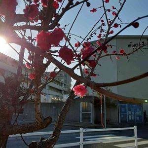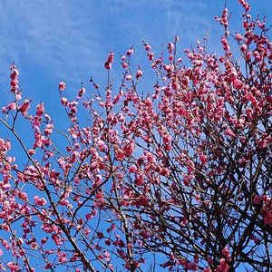紅梅が青空に映えて綺麗でした。ここで畑を作っているおじさんに許可を貰って撮りました。