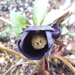 お店の方が「これも素敵ですよ♪」と言うので、このコも連れて帰りました😅 クリスマスローズ・グレイシャスブラック🖤💛 紫がかったブラックの花びらに黄色い蕊がカッコ良いお花です🤗