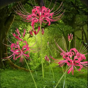 今日のお花\(╹◡╹๑♬ 昨日、お墓参りに行ったお寺の庭に彼岸花が咲いていました 日暮の蝉の声と爽やかな秋空が広がって、いつもよりゆっくり過ごしてきました 20日迄、携帯のカメラ機能が変になり写せなくなり、🎇大会も撮れなくて┐(‘~`;)┌ なおしに行って たまたま 撮った境内で咲いてた 彼岸花の背景を コラージュしての投稿です (今まで知らなかった機能で)