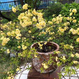 モッコウバラ ずっと鉢植えで🪴育てています。 花は少し小ぶりです。 本当は地植えしてあげたいのですが… 植える場所と蔓の伸びを考えるとそれもできません。 今年は新しい土で植え替えてあげることで許して!!!