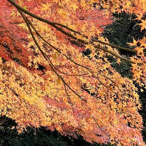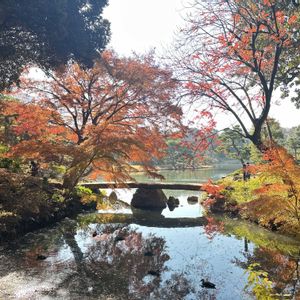 六義園の渡月橋 イロハモミジの葉が池に散りかかってました🍁 約2mほどの大きな石を2枚繋げただけの橋 短くとも傾斜があり、オ〜ッという感じで渡りました😊 高さ35mでも築山藤代峠からの眺めは爽快でした。 5枚目の黄色も残るモミジの葉 こちらはオオモミジかも⁉︎🍁 モミジでyoyoさんの🏷️木曜日は木に🙋♀️