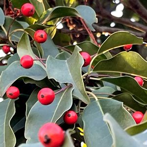 今年も、青々とした葉のなかで、ソヨゴの赤い実を見つけました①② モチノキ科 モチノキ属 常緑小高木 別名はフクラシバ 波状の葉がそよそよと風に揺れることから命名された ようです 6月頃に目立たない白い小さな花をつける 今年も花を見過ごしてしまいました 「冬青」は、冬でも葉が青々と茂っている常緑樹のことだそうです 他に赤い実を付ける木がそばに生えていました ③ナンテン 真っ赤な実がたわわに成っていました もうすぐヒヨドリの餌食になってしまうのかな? ④クチナシの実 クチナシの実は味や香りがほとんどないため、食材や料理の風味を損ねることなく色付けすることができます もうすぐお正月ですね 栗きんとん作りに欠かせないですね 🏷️木曜日は木 🏷️木曜日の木々たち 🏷️木曜日は気(木)になる実