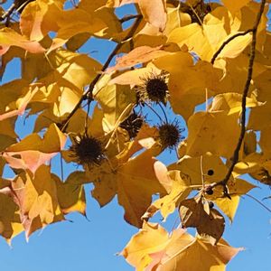 先日の、京都府立植物園のフウの木 黄葉と実 🟦青空に映えて,とても印象的でした