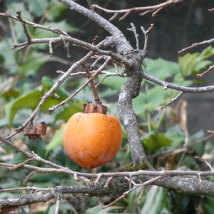 「カキ」 我が家の庭隅にある柿の木。 何故か一つだけ実っています。 周辺を飛び回る野鳥たちも渋柿なので見向きもしないようです。 🏷木曜日は木の実 🏷木曜日は木