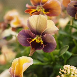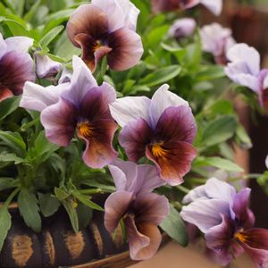 茶にラベンダーの覆輪が美しいビオラ。12月の写真です。後ろのスイートアリッサムは霜で傷んでカットしました。毎日寒いですね~。。