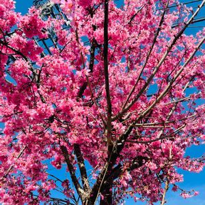 🌸カンヒザクラ(寒緋桜)🌸 ① 朝から雨降りだったけど、昼頃から快晴☀️ 気温もグングン上がって26度!暑いくらい 青い空に濃いピンク色の寒緋桜が満開🌸 **カンヒザクラ(寒緋桜)** バラ科サクラ属 別名 ヒカンザクラ(緋寒桜) タイワンザクラ(台湾桜) ヒザクラ( 緋桜) カンジツザクラ(元日桜) 花言葉 「艶やかな美人」