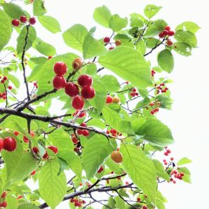 桜の実が色づいています。 これもサクランボというのでしょうか? サクランボの絵を描く時って、🍒というふうに二股に描きますよね? あれはわざわざ2コずつに切ってるの⁇