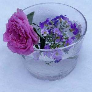 バラとサクラソウ💜 グラスに浮かべて見た (雪が降る前のpic) 🏷️素敵な水曜日 🏷️(祝)青い花マニア7周年 🏷️春を呼ぶ青い花2025 🏷️つなぐ、つながる