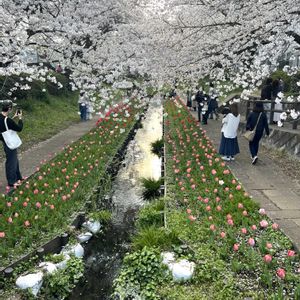 江川せせらぎ緑道のソメイヨシノとチューリップのコラボです。 陽の光に反射して水面に映っている桜がとても綺麗でした