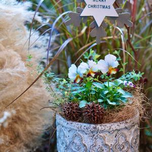 今朝はなんと雪がチラホラ❄️ いよいよ冬本番になりましたね*ˊᵕˋ* お庭ごとにはちょっと寒すぎる 今日の木の日は 家の片付けや身の周りのお付き合いのあれこれをやっておきたいなと思っていたから 私にとってはちょうど良い日と前向きに♡⃛ 先週がもう懐かしく 暖かくてラッキーでした*ˊᵕˋ* 日の日と併せて寄せ植えやクリスマスのシーンをつくってみたりと めいっぱいお庭遊びを楽しんで まだもう少し素材があるのと 球根はまだこれからですけどね🌷 せっかくなのでクリスマスまでに毎日コースで投稿してみようかなと 皆さんと一緒に楽しめたら嬉しいです*ˊᵕˋ* 先ずは入り口から ようやくクリスマスローズ花壇を✨🎄✨ お馴染みローズマリーの◯と 立札は小豆色に塗ってみて 寄せ植えをえっちらおっちら運んで 小さなボールバードにクリスマスツリーになってもらいましょう✨🎄✨ さて、もみじの庭が寂しくなっちゃうので 今年はシルバークレストはこちらへ ✨🎄✨ はまた登場させることにして ビオラ ヌーヴェル ヴァーグ タイム ロータスブリムストーン 枝から✩.*˚を降らせて できあがり♡⃛ 日中は陽当たりが良いからか 後ろに植っているまだまだ元気な パープルファウンテングラスと 色味がリンクして♡⃛ お気に入りコーナーになりました*ˊᵕˋ*
