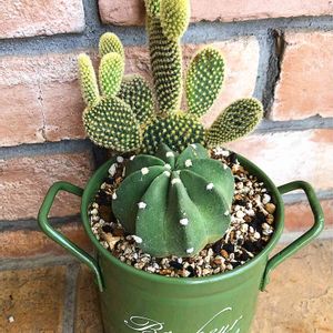 おはようございます♪ 先日upした彩雲閣と同じ物を雑貨屋さんで発見👀 この鉢(本当は鉢じゃないけど🤣)には やっぱり🌵かな! という事でバニーカクタスちゃんと名無しのトゲのないまんまるちゃんを植えました。 まんまるちゃんは何て子かしら? 解る方居ましたら教えて下さいませ🙏