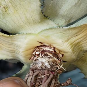おはようございます⛅ アガベ☆風雷神縞斑 下葉を処理していたら根っこだと思ったら 先端に棘の様な物が🧐 これは子株なのかな? 根っこがみんな枯れてるので根っこを出して欲しい😅