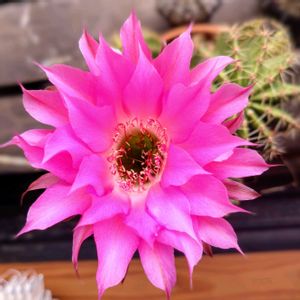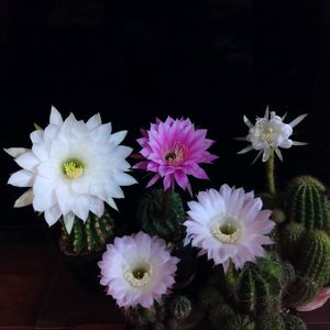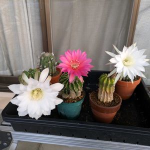 エキノプシス。去年は一つも咲かなかったけど、春に子株を全部はずしてあげたら花が咲くようになった😊 今シーズンもう3度目の開花🩷 2枚目はエキノケレウス・クラッペリと表記されていたけど和名が分からない。植え替えた途端に蕾が沢山あがってきて、しばらく楽しませてくれそうです。
