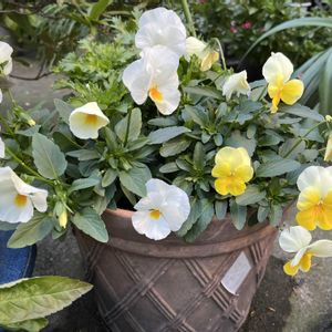 よく咲くすみれパンジーのレモネードとミルクセーキが咲き溢れています❣️😊ホントよく咲くので毎年購入しています。今年は、藤の枝の支柱が刺さっている大きめの植木鉢(重くて移動不可)に植えてみました。土も硬いし古いので気になってはいたけれど、藤の葉が落ちるとガラーんとして寂しく見えるのでここに😊心配をよそに溢れんばかりにさいてくれ、ご近所さんの目にもとまっているようです🤭 黄色はみーちゃんがよく似合っていた特別な色なので必ず取り入れています❣️