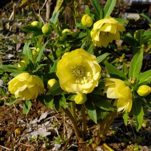 クリスマスローズ 黄色のダブルです。まん丸の蕾が沢山あるので楽しみです。 ・ 珍しく上を向いてくれるので撮影も楽です✌ ・ ミスティローズのラベルを付けてありますが、ひょっとして間違い?😨