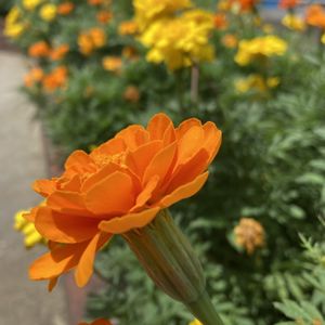 今日のお花 マリーゴールドの小径 ♫麦わらの〜帽子の... あの歌でスッカリ有名に なった 花の名前 マリーゴールド🟡🟠