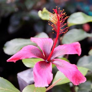 【ハイビスカス・フィジーアイランド(フィジーレッド、フィジアンレッド)】 フィジー諸島原産、アオイ科常緑低木 「フィジーレッド」とも呼ばれる、細弁大輪花の一重咲き品種。 ピンク色の花弁に中心は赤褐色の花色が特徴的。 樹高:1~2m程度 開花期:6月~10月(温室ではほぼ1年中開花) 花色:ピンク~赤褐色 ときわミュージアム@宇部市