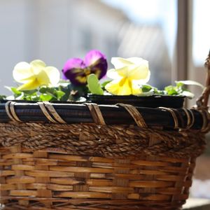 黄色の🌸良く咲くスミレ🌸さん 咲いてきました😊 紫色のビオラさんと共に 籠に入れてみました 可愛い💛💜💛