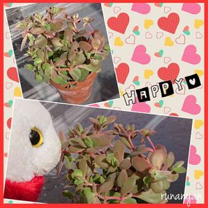 【エケベリア属 ピーチプリデ】 Echeveria 'Peach Pride' (×パリダ?の交配種) 【クラッスラ属 ワテルメイエリー】 Crassula atropurpurea var.watermeyeri GSで拝見したはる✾ 様の寄植えが とっても素敵だったので、 真似させていただきました ピーチ🍑の名前に合わせて、 ピンク💗のハート柄のリメ鉢にIN このまま小ぢんまりと 可愛く育ちますように (*˘︶˘*).。*♡