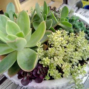 ゴールデングローを主役に ワテルメイエリーと 沢山のセダムを使って寄せ植えしました。 作って約 1週間。もっとセダムが増えて欲しいです❣