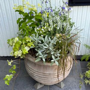 お久しぶりですෆ˚* 5月に仕立てた寄せ植えの植栽が 枯れたり乱れたりしてきたので 仕立て直しました𖤣𖥧𖡼.𖤣𖥧 写真は1番大きな寄せ植えです...。 1枚目は仕立て直した寄せ植え、 2枚目はbefore(5月撮影)