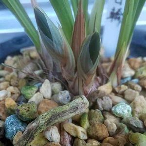 春蘭「日輪」です。先日のものとは別の株です。こちらのほうが蕾が膨らんでいて、しかも蕾が多いです。写真の二つと、裏側にもう一つ花芽があります。