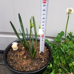 「スノーフレーク」③ 「シロツメグサ」別鉢 ②のスノーフレークが背伸びしている! 3倍近く背がのびた! 花をつけてからも伸びるんですね。 シロツメグサの別鉢(四つ葉のクローバーのあった鉢でないやつ)に花が咲いてた。 2つ咲いていたよ。