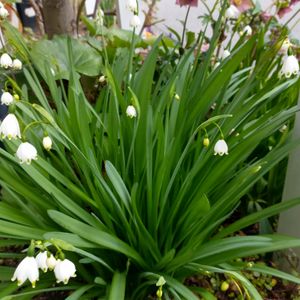 「スノーフレーク」 ベランダのスノーフレークが沢山咲いてました🎶 スノーフレーク3鉢の真ん中の鉢 この鉢めちゃくちゃ群生してます。 この右側に金の成る木とコラボのスノーフレークがあります。