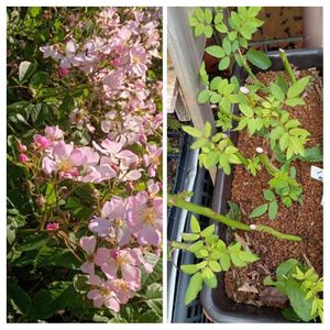 昨年春の川散歩🎵で見つけたビンクのノイバラ 11本挿し木して10本発根していました。🤗 地植えにすると手入れが大変そうなので鉢植えにしました。🤗 花が楽しめるのは何時のことやら❤️🎵🤔