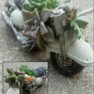 壊れた車シリーズ③ 車だけではなくバイクもあったんです ポイントは多肉ライト もともと壊れて穴が空いていたライトを活用しています 多肉の寄せ植え遊び楽しいけれど そろそろ土が底をついてきた…… 土買いに行かなくちゃ……