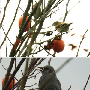 甘くなった柿は小鳥たちに人気。 一番小さなメジロは隅で順番待ち。 大きなヒヨドリが来るとスズメも場所を譲ります。