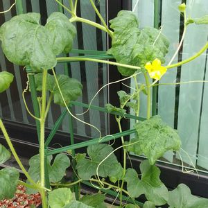 グリーンカーテン用にとアサガオ、ゴーヤ、フウセンカヅラの苗を貰って来たので初チャレンジ 有り合わせの材料で上手くできたと自画自賛