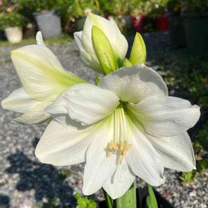 我が家の庭で,真っ白なアマリリスが咲いてきました‼️ 大きな三つの花がそれぞれに向いて,一緒に撮れなーい 初めて咲いた清純な、美しい花に心が洗われるようです🤍