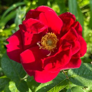 秘密の花園で、ロサガリカ オフィキナリス満開です ターシャも愛した真っ赤なオールドローズです🌹 横張性で、ヒラヒラとした花弁が揺れて美しいバラです