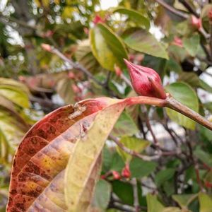 ハクサンボク 雄しべ、雌しべが短い小花がたくさん咲いているのを見かけた 白い水曜日♡🏷 冬芽は真っ赤だ🔴半円形の葉痕に維管束痕は3個が見える∵ 展開前の葉も赤くモコモコと膨らんでいる🟥広がれば次第に艶のある緑になり、山照らしの別名もある🟩 実は仲間のガマズミに似ているけれど常緑で、今からが花の盛り◎蕾がたくさんついている(,,>᎑<,,) 西日本の沿岸部に自生しているものだが、伊勢神宮にも植えられているそうでが、こちらでは庭木になっていた♬