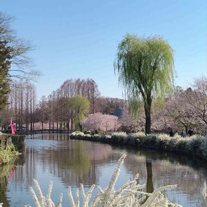 枝垂れ桜が咲いていた広い公園🌸 柳の新芽の緑、満開のユキヤナギの白 桜並木の淡いピンク 穏やかな気持ちいい日でした(*´꒳`*)