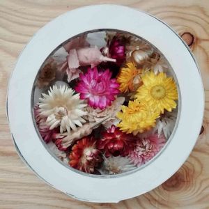 箱の中にざっくり入れた花材たち🌼🌸 このまま飾ってもいいぐらいかわいい🥰 ヘッド部分はリースの飾りに使います。 Instagramでは作り方のポイントも紹介していますのでよかったらそちらも覗いてください🌟
